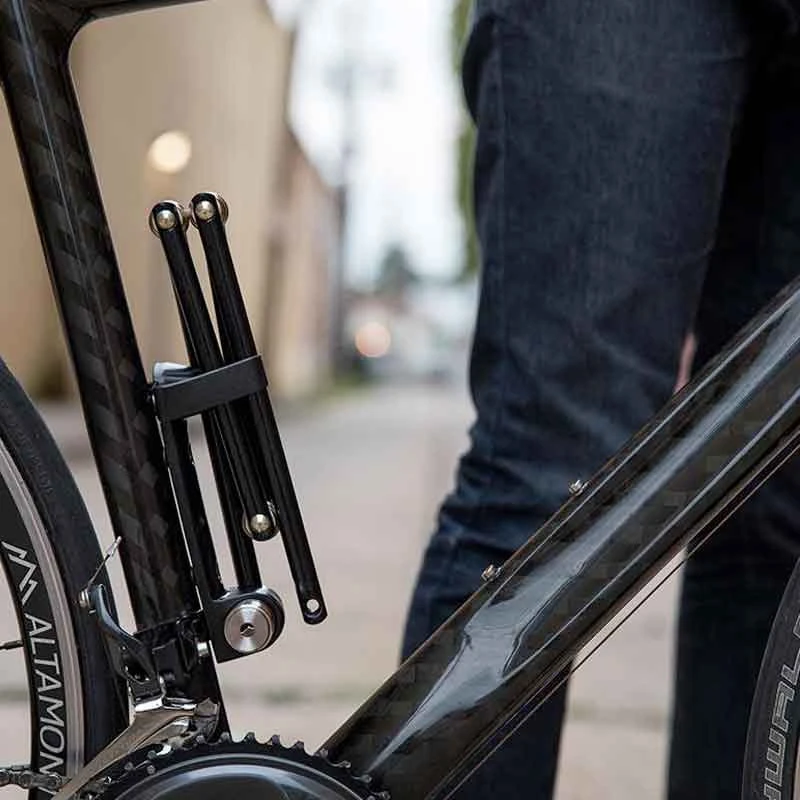 Mitgeliefert wird eine Halterung, die man wie einen Flaschenhalter anbringen kann. Außerdem kann man optional auch eine Satteltasche bekommen, in die das Schloss perfekt hineinpasst.