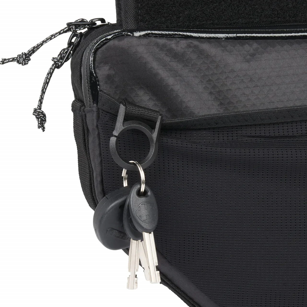 Ein abgedichteter Reißverschluss, welcher über die Taschenlänge geht, schützt den Inhalt vor Wasser und Staub. Durch die großzügig gestaltete Öffnung der Tasche lässt sich der Inhalt bequem entnehmen und ihr habt schnellen Zugriff. Hilfreich ist auch die helle, gelbe Farbe: anders als bei dunkleren Taschen findest du kleinere Gegenstände leicht wieder. Für die Dinge, die du in Reichweite haben möchtest, gibt es auf der linken Seite ein Meshfach welches von außen zugänglich ist. Hier kannst du dein Smartphone verstauen und deine Schlüssel am integrierten Anhänger sichern. Im zweiten Seitenfach rechts (mit Klettverschluss) ist der Slinggurt verstaut.