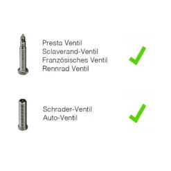 Funtioniert bei Auto-Ventilen (Schrader) und Rennradventilen (Presta), ohne das man etwas umschrauben muss.