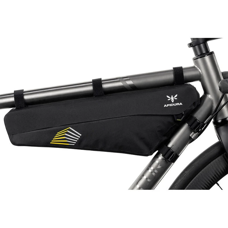 Das Racing Frame Pack besteht aus Hexalon – einem extra für Apidura entwickelten Schicht-Gewebe. Alle Merkmale wurden auf Langdistanzgebrauch und Strapazierfähigkeit hin optimiert.An wichtigen Stellen wird die Tasche mit geschäumtem Material verstärkt. So erreicht man ein kleine und dennoch leichte Tasche. Sehr praktisch ist der geschützte Kabelauslass im Frontbereich.