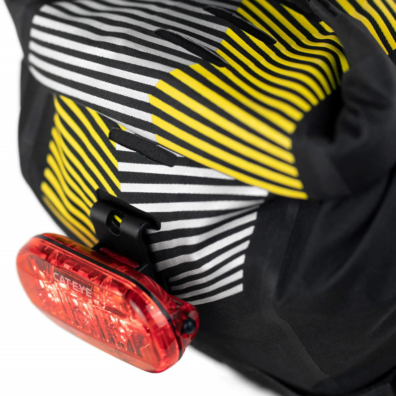 Aus ultraleichtem, wasserdichtem Laminat-Stoff geschnitten, wiegt die Tasche nur 210 Gramm. Die übliche 3-Punkt-Befestigung hält die Tasche sicher und ergonomisch unter dem Sattel. An dieser Stelle steht sie optimal im Wind.