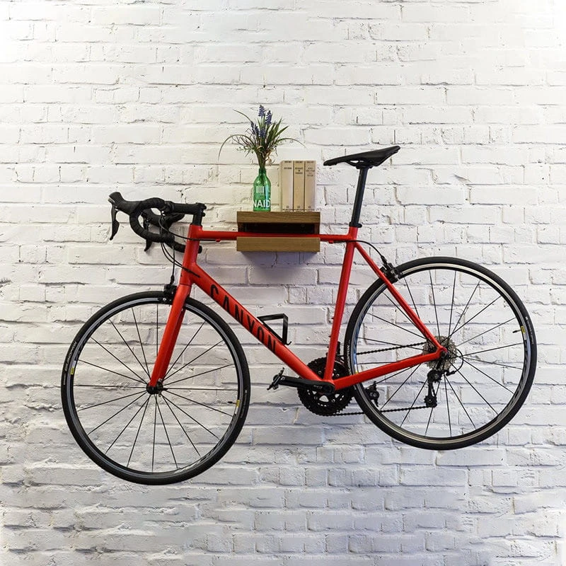 Die optisch sehr ansprechenden Wandhalterungen von BicycleDudes, ermöglichen eine platzsparende Unterbringung deines Rades in der Wohnung, Garage oder im Keller. Besonders praktisch ist, dass es nicht nur eine Halterung ist, sondern auch gleichzeitig Stauraum bzw. Platz für Dekoration bietet.