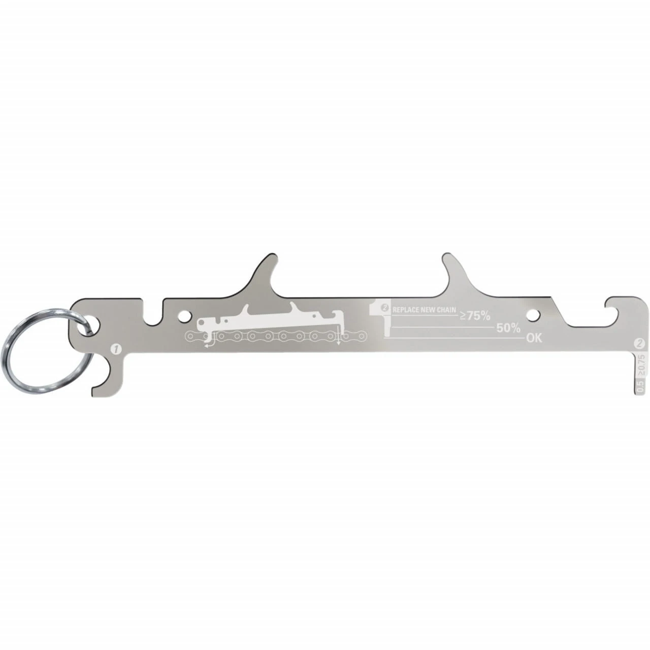 Schick verchromt, 28 g leicht kommt diese Kettenlehre zwar wie ein Schlüsselanhänger daher, ist aber in Wirklichkeit ein nützliches Multitool, das mit dem Schlüsselring wunderbar in der Biketasche fixiert werden kann. Neben der Kettenlehre kannst du die Kette auch einhaken und zum Auswechseln von Kettengliedern fixieren. Eine Kerbe dient außerdem als Hebel zum Öffnen von Ventilkernen. Und wenn du auf deiner Tour einmal anhältst um dich zu erfrischen – ein Flaschenöffner ist natürlich inklusive!