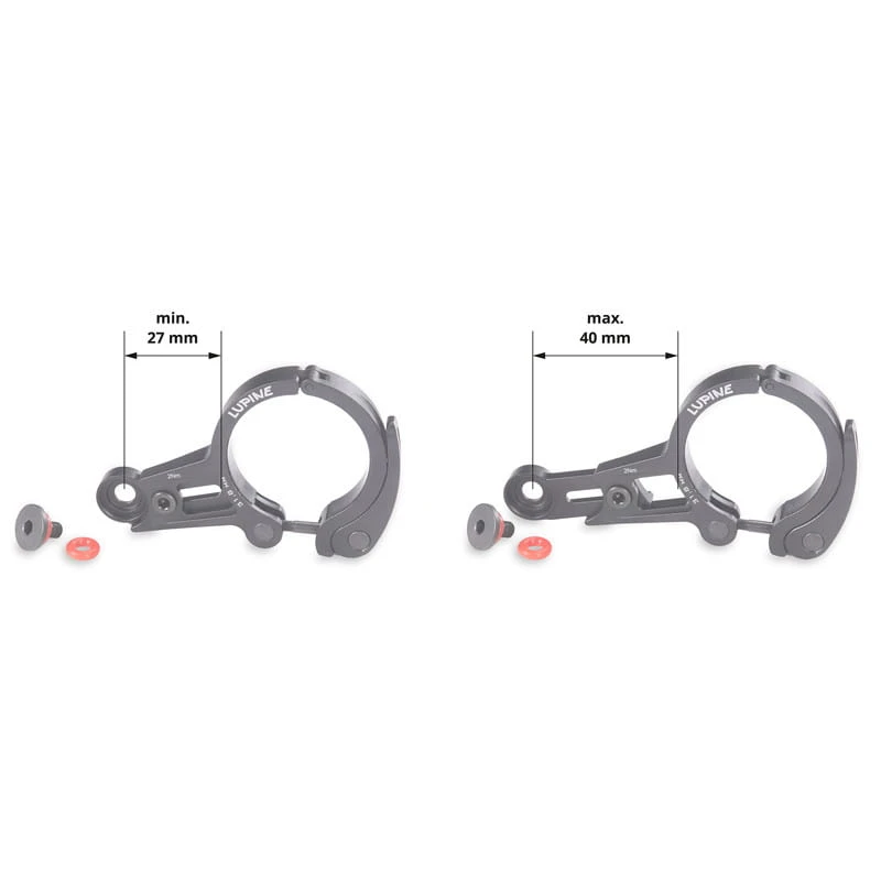 Abstand vom Befestigungsloch der Halterschraube zum Halterrand minimum ca. 27mm, maximal ca. 40mm, Schellenbreite 9mm. Die Halterung besteht aus CNC-gefrästem und anschließend schwarz eloxiertem Aluminium. Die Gummiauflage verhindert Kratzer und sorgt für festen Halt am Lenker.