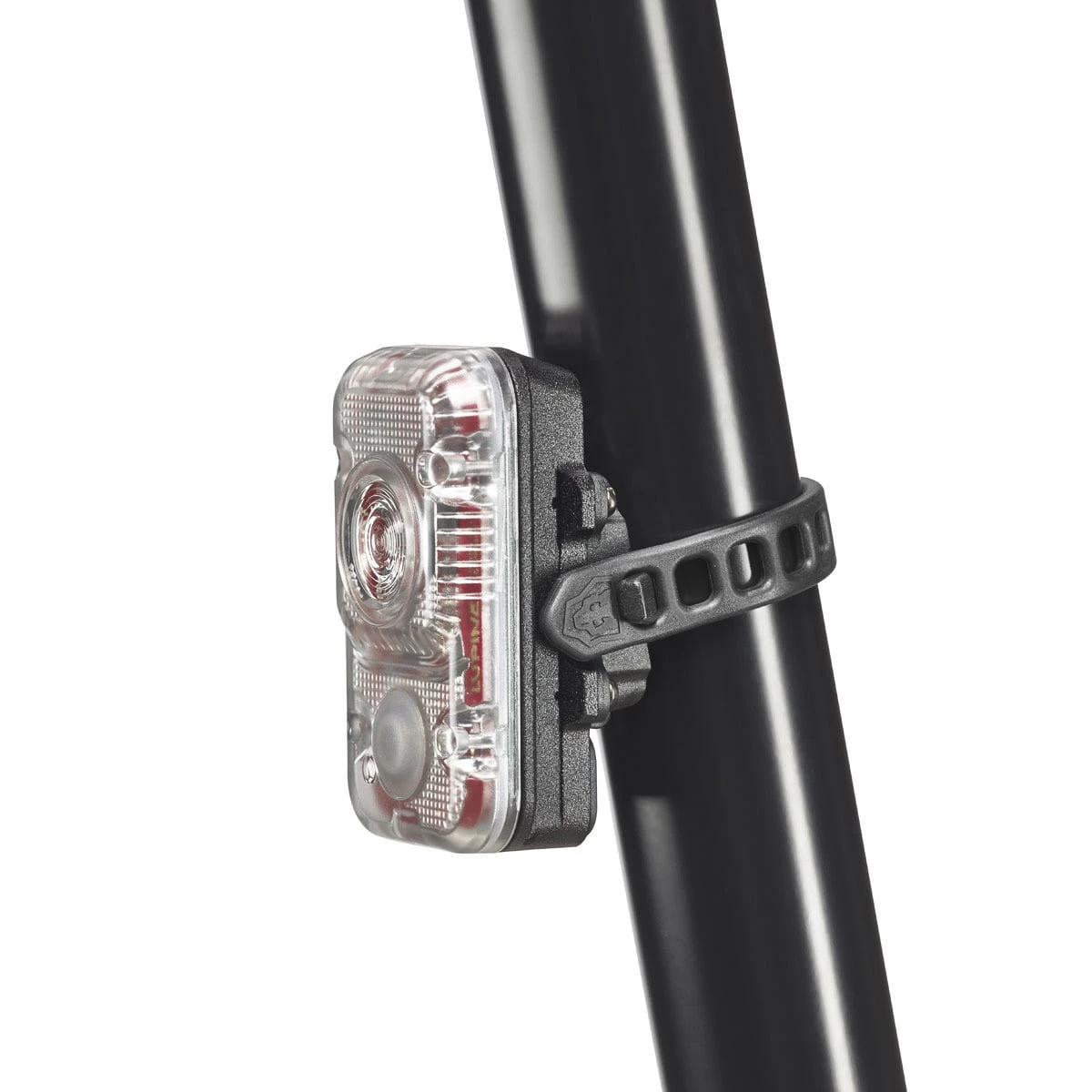Fit für den Straßenverkehr: Das kleine Rücklicht mit nur 55 Gramm Gewicht strahlt mit für diese Größe erstaunlichen 40 Lumen. Für den täglichen Einsatz bei Wind und Wetter ist es perfekt, denn dem spritzwasserfesten Gehäuse können die Elemente nichts anhaben. Ein zusätzliches Sicherheits-Extra ist der Beschleunigungssensor, so leuchtet es heller auf, wenn du abbremst.