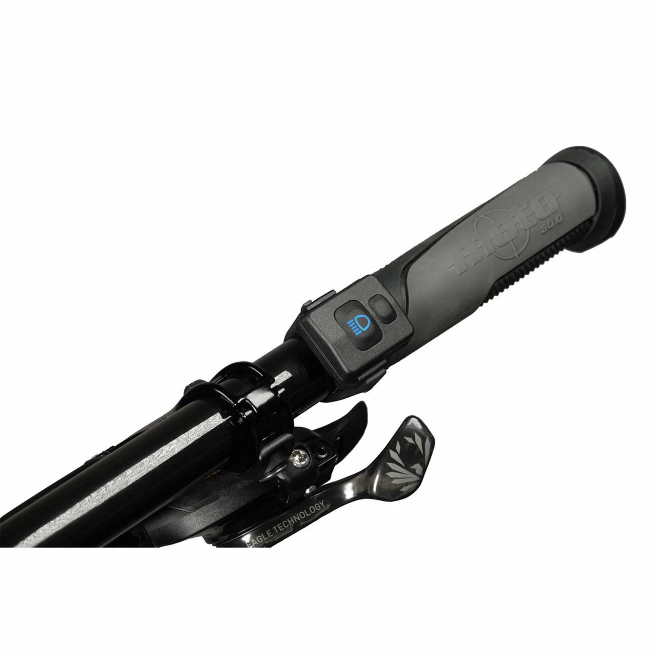 Für einen einfachen Wechsel zwischen den verschiedenen Einstellungen ist eine Bluetooth-Fernbedienung im Lieferumfang enthalten. Sie kann mit der mitgelieferten Halterung (Peppi V5) an Lenkern bis 22 mm Durchmesser befestigt werden. Mit der kleinen Taste können die Leuchtstufen des Abblendlichts eingestellt werden. Die große Taste aktiviert das Fernlicht und schaltet die Lampe bei längerem Drücken aus.