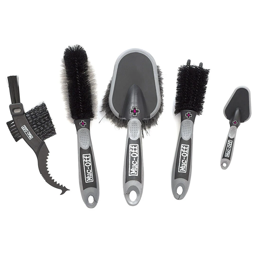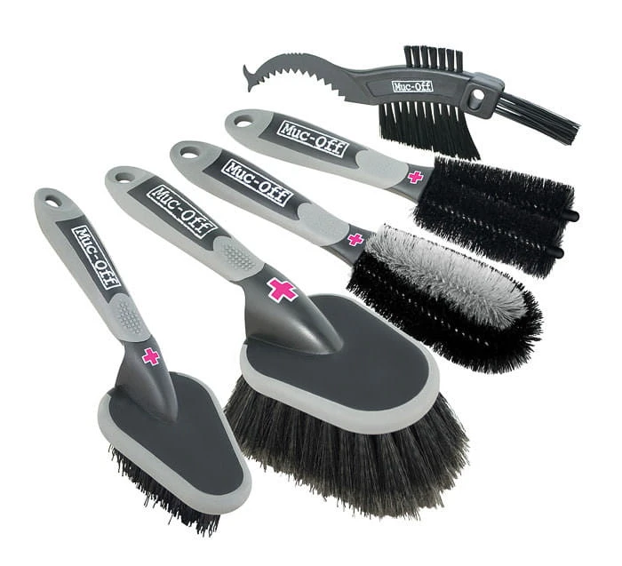 Die große Bürste hilft beim Reinigen des Rahmens, Lenker und Laufräder. Die kleine Bürste reinigt schwer erreichbare Stellen, wie z.B. Naben, Gabelkrone. Die Claw-Bürste reinigt die Kettenblätter, Kassette und Kette. Die Laufrad- und Komponenten-Bürste ist auf Grund der besonderen Form ideal für die Laufräder, Speichen und Felgen geeignet. Die Two Prong Bürste mit ihren zwei biegbaren Bürsten eignet sich sehr gut für Teile wie Pedale, Kurbel oder Dämpfer.