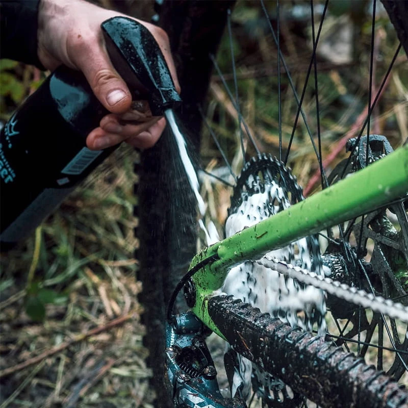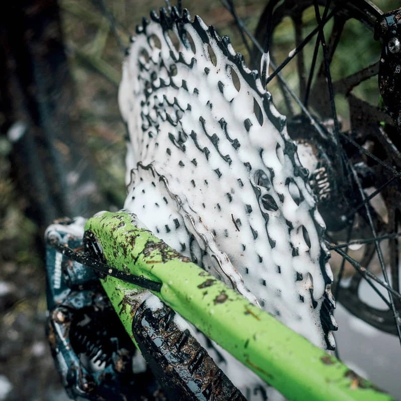 Den Antrieb mit Foaming Drivetrain Degreaser großzügig einschäumen, zwei Minuten einwirken lassen und anschließend mit Wasser abspritzen.