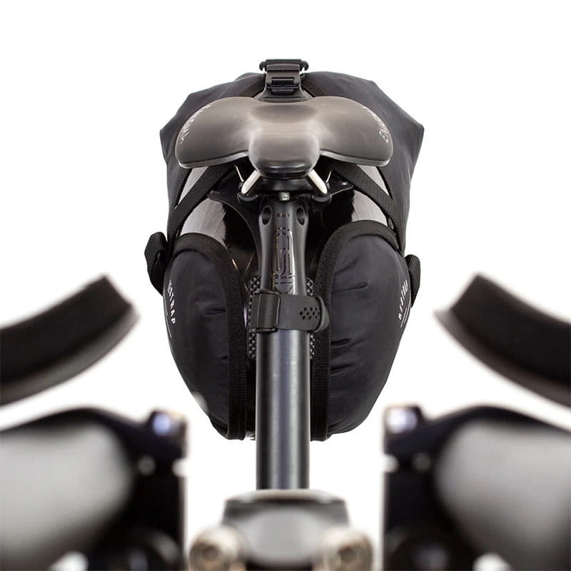 Die neue Restrap Race Saddle Bag besteht aus zwei Teilen. Zum einen ein Holster, welches die Tasche in Form hält und am Fahrrad befestigt wird. Zum Anderen aus dem Dry Bag, welcher im Holster eingespannt wird und Platz für dein Equipment bietet. Der Dry Bag verfügt über 7 Liter Volumen und wird mit einer Fidlock-Magnetschnalle im Holster befestigt. Zusätzlich sind die Logos an der Seite des Dry Bags reflektierend und sorgen für verbesserte Sichtbarkeit bei Nachtfahrten. Der Holster wird über Hypalon-Gurte an der Sattelstütze und den Sattelstreben befestigt.