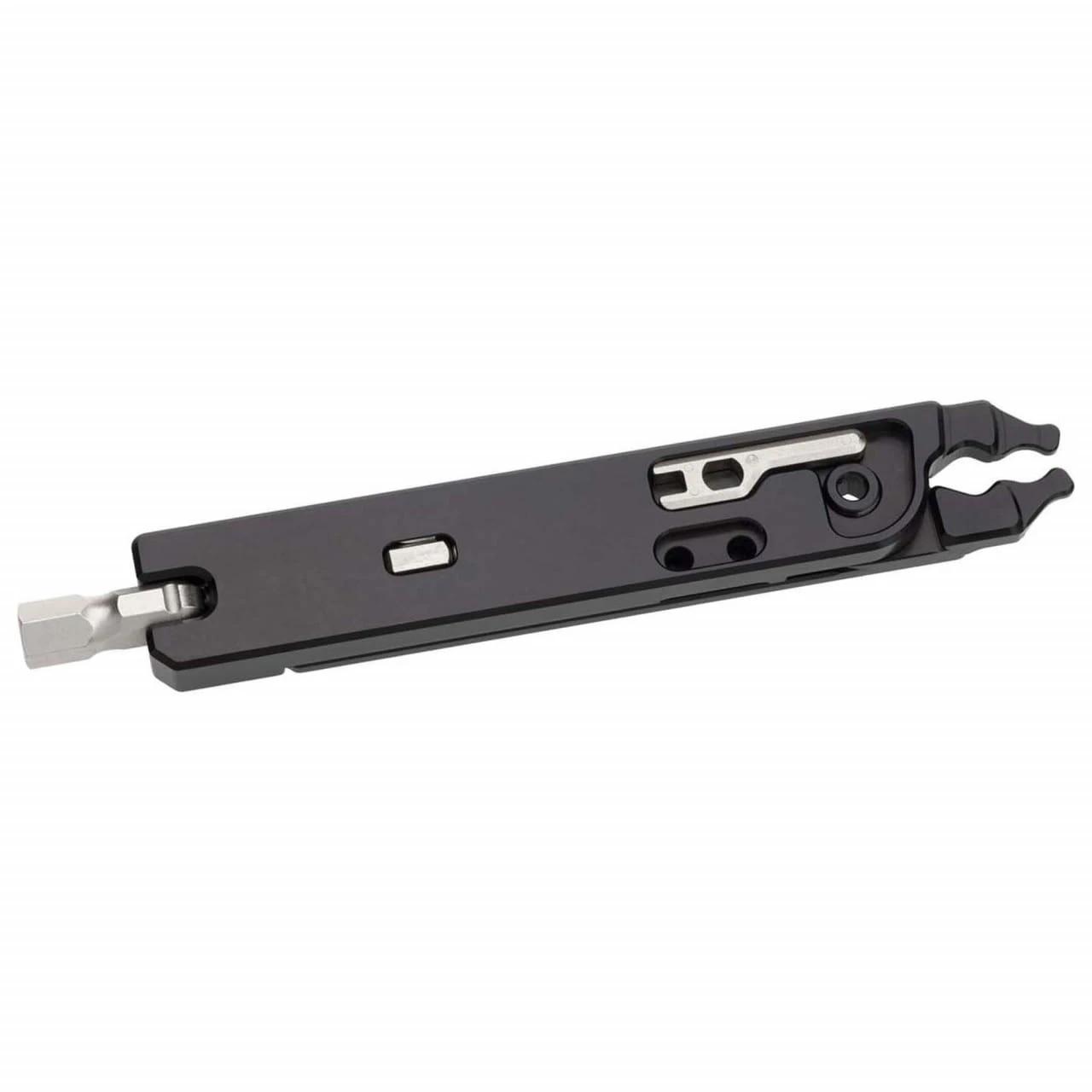 Multitools mit verschiedenen Funktionen gibt es viele, warum also ein weiteres? Weil sich das Designteam von Wolf Tooth den vielleicht cleversten Aufbewahrungs-Mechanismus für die Bits ausgedacht hat: 8 Aufsätze ruhen im Inneren der Masterlink-Zange – magnetisch gesichert. Sie kommen zum Vorschein, wenn der Griff scherenartig aufgeklappt wird, was haptisch wunderbar gelöst ist, denn die Metalloberfläche ist an dieser Stelle geriffelt. Mit derselben Bewegung wird auch die Kettenschlosszange am anderen Ende bedient.